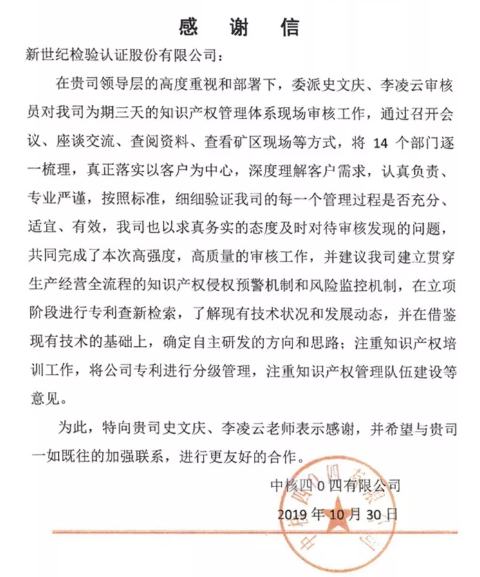 近期,中核四O四有限公司(下稱“四O四”)順利獲得了由新世紀(jì)檢驗(yàn)認(rèn)證有限責(zé)任公司(簡(jiǎn)稱BCC)頒發(fā)的知識(shí)產(chǎn)權(quán)管理體系認(rèn)證證書。四O四獲證后給BCC發(fā)來一封感謝信,感謝BCC領(lǐng)導(dǎo)層和審核組在認(rèn)證審核過程中表現(xiàn)出的專業(yè)性和責(zé)任心。