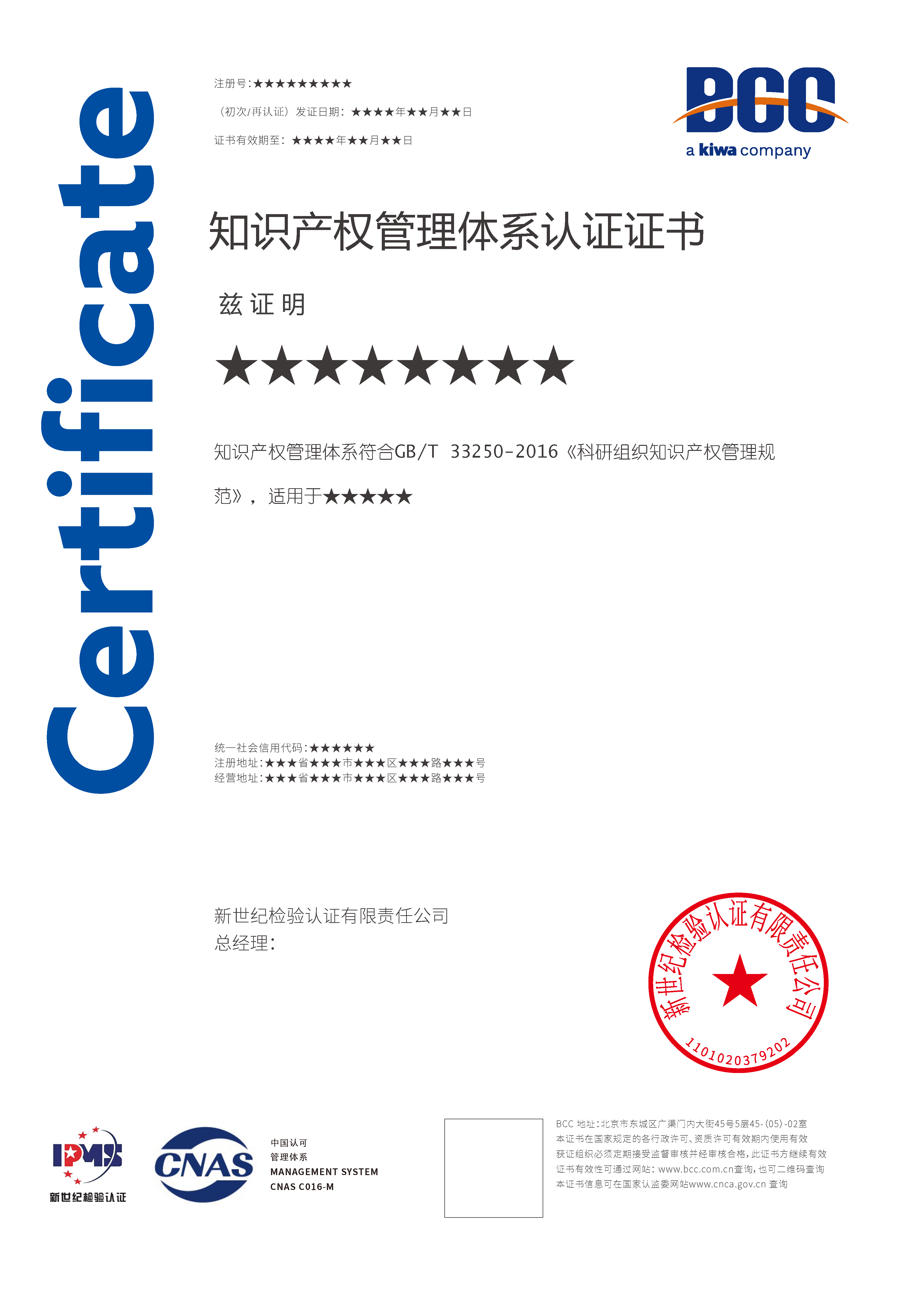 Kiwa BCC是首批獲CNAS認(rèn)可的知識(shí)產(chǎn)權(quán)認(rèn)證機(jī)構(gòu),可為企業(yè)頒發(fā)帶有“CNAS”標(biāo)識(shí)的知識(shí)產(chǎn)權(quán)管理體系認(rèn)證證書。認(rèn)證所用標(biāo)準(zhǔn)包括:GB/T 29490-2023《企業(yè)知識(shí)產(chǎn)權(quán)合規(guī)管理體系要求》、GB/T33250-2016《科研組織知識(shí)產(chǎn)權(quán)管理規(guī)范》、GB/T33251-2016《高等學(xué)校知識(shí)產(chǎn)權(quán)管理規(guī)范》。