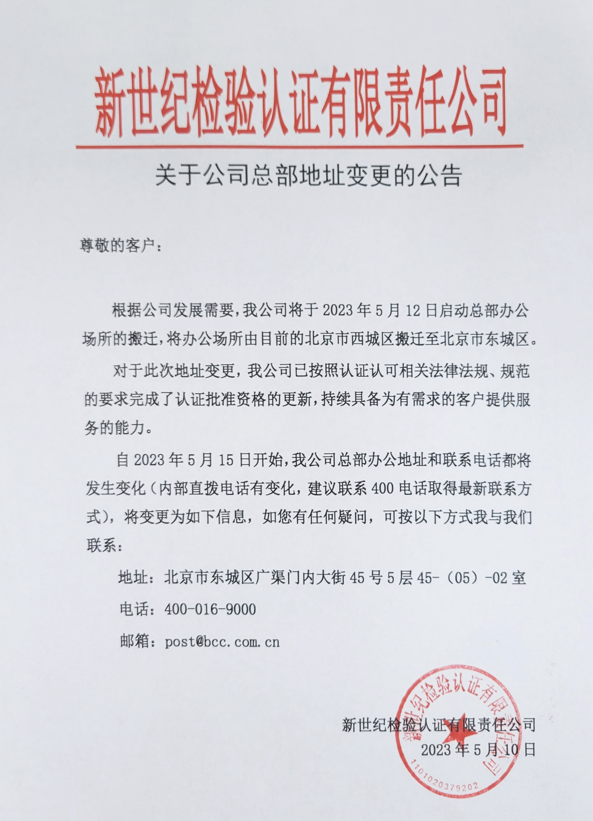 對(duì)于此次地址變更,我公司已按照認(rèn)證認(rèn)可相關(guān)法律法規(guī)、規(guī)范的要求完成了認(rèn)證批準(zhǔn)資格的更新,持續(xù)具備為有需求的客戶(hù)提供服務(wù)的能力。