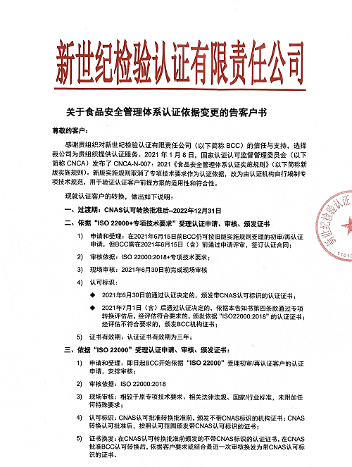 關(guān)于食品安全管理體系認證依據(jù)變更的告客戶書