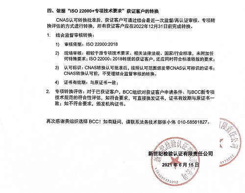 • 2021年7月1日(含)后通過認證決定的,依據(jù)本告知書第四條款通過專項轉(zhuǎn)換評估后,經(jīng)評估符合要求的,頒發(fā)依據(jù)“ISO22000:2018”的認證證書;經(jīng)評估不符合要求的,頒發(fā)BCC機構(gòu)證書;