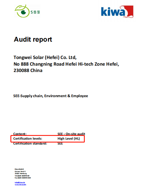作為全球認(rèn)證領(lǐng)域20強(qiáng)企業(yè),Kiwa集團(tuán)專家與Kiwa BCC專家對(duì)企業(yè)進(jìn)行了現(xiàn)場(chǎng)審核、通過員工訪談,以及文件評(píng)審等工作,最終為通威太陽能頒發(fā)了首份依據(jù)SEE標(biāo)準(zhǔn)的ESG現(xiàn)場(chǎng)評(píng)估報(bào)告,并高度評(píng)價(jià)了通威太陽能在ESG管理方面的突出表現(xiàn)。報(bào)告涵蓋可持續(xù)的企業(yè)治理、供應(yīng)鏈管理、員工權(quán)益、環(huán)境管理四個(gè)部分,總計(jì)約50個(gè)主題,在全球范圍內(nèi)有著較高且廣泛的客戶接受度和權(quán)威公信力。
